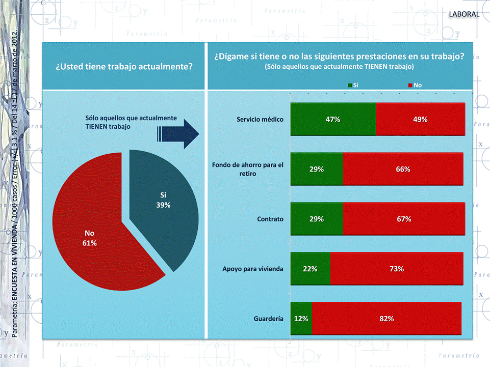 La mayoría de los trabajadores mexicanos no cuenta con las prestaciones marcadas por la ley, de acuerdo con la más reciente Encuesta Nacional en Vivienda de Parametría.