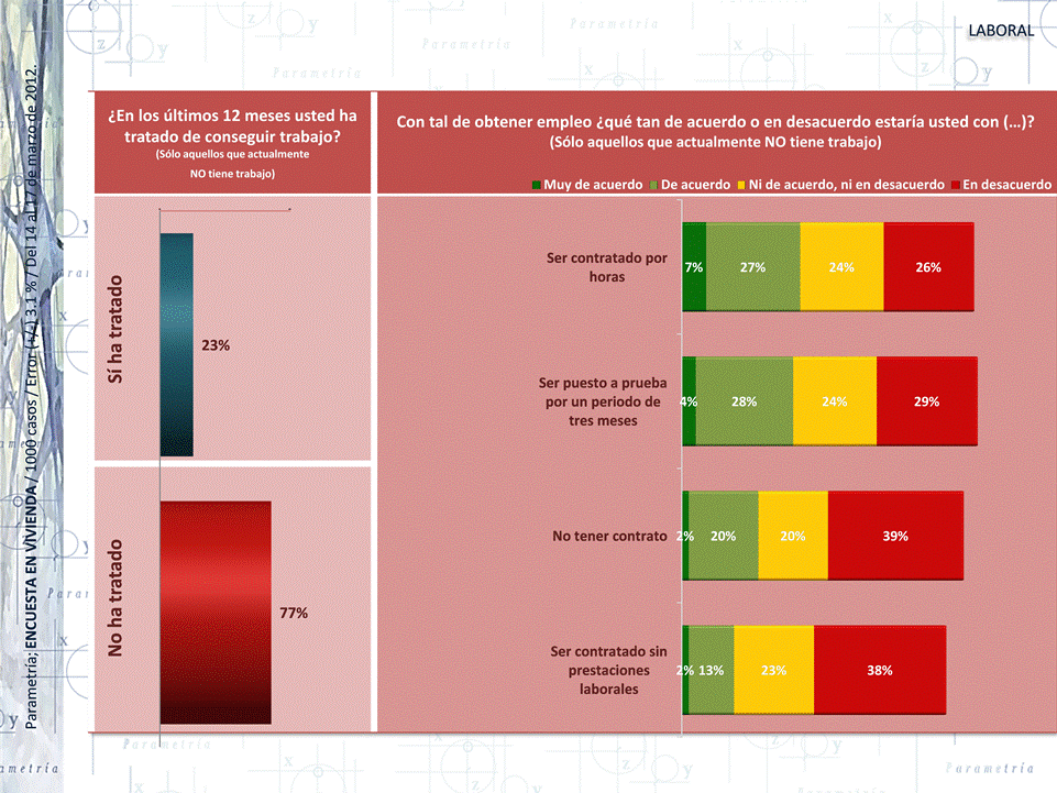 PARAMETRÍA. Encuesta Nacional en vivienda. Representatividad: Nacional. Número de entrevistas: 1000 encuestas del 14 al 17 de marzo 2012. Nivel de confianza estadística: 95%. Margen de error: (+/-) 3.1%. Diseño, muestreo, operativo de campo y análisis: Parametría SA de CV. Método de muestreo: Aleatorio sistemático con probabilidad proporcional al tamaño. Unidad de muestreo: Las secciones electorales reportadas por el IFE.