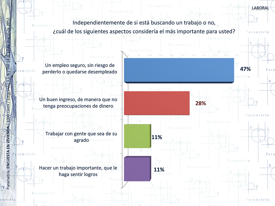 Para los mexicanos, lo más importante en materia laboral es la estabilidad. Así lo manifiesta el 47% de encuestados que considera como aspecto fundamental tener un empleo seguro, sin riesgo de perderlo.
