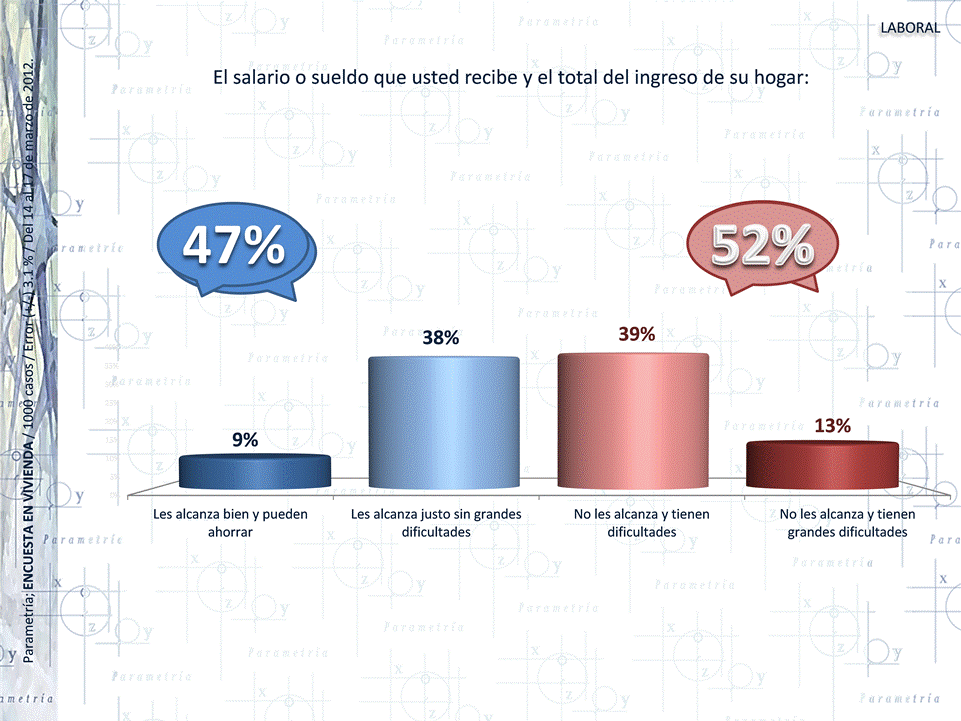 Menos de uno de cada diez mexicanos (9%), declara que lo que percibe le alcanza bien y puede ahorrar.