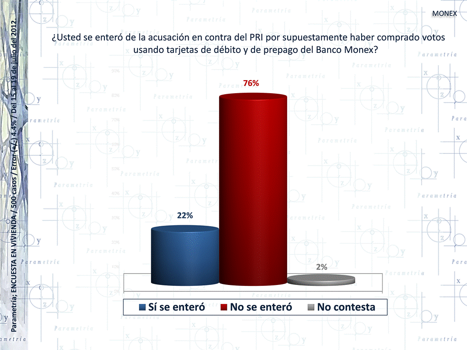 PARAMETRÍA. Encuesta Nacional en vivienda. Representatividad: Nacional. Número de entrevistas: 500 encuestas realizadas a personas de 18 años en adelante con credencial para votar que residan en el lugar de interés al momento de la entrevista. Fecha de levantamiento: del 15 al 19 de julio de 2012. Nivel de confianza estadística: 95 %. Margen de error: (+/-) 4.4 %. Diseño, muestreo, operativo de campo y análisis: Parametría SA de CV. Método de muestreo: Aleatorio sistemático con probabilidad proporcional al tamaño. Unidad de muestreo: Las secciones electorales reportadas por el IFE.