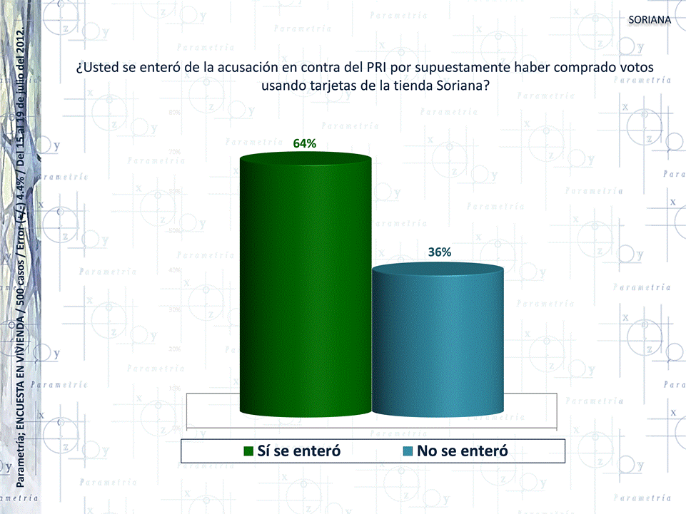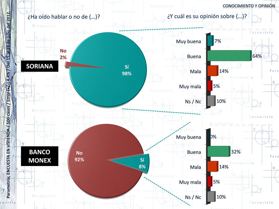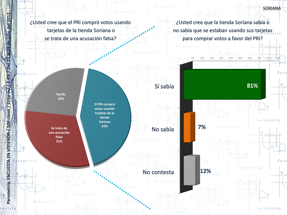 Considerando los datos de la medición de julio de 2012, son más los encuestados que creen que el PRI promovió el voto a su favor usando tarjetas Soriana que tarjetas del Banco Monex. Es posible que ésta percepción resulte del poco conocimiento que el Banco Monex tiene entre los mexicanos: el 8 % de los entrevistados ha oído hablar de tal institución, en comparación con el 98 % que conoce los supermercados Soriana.