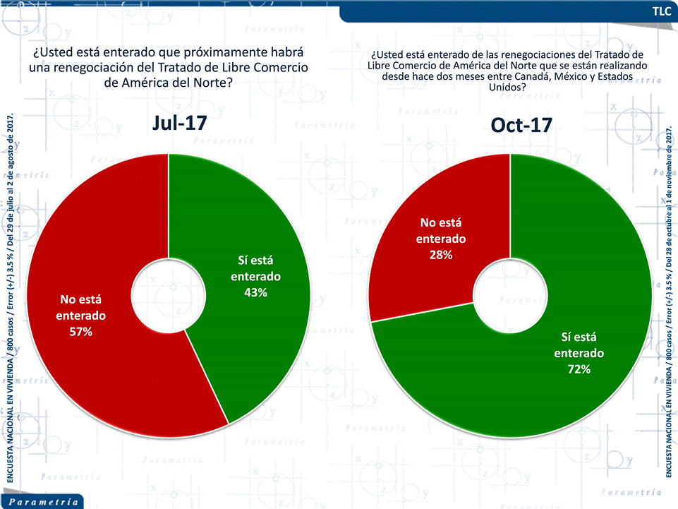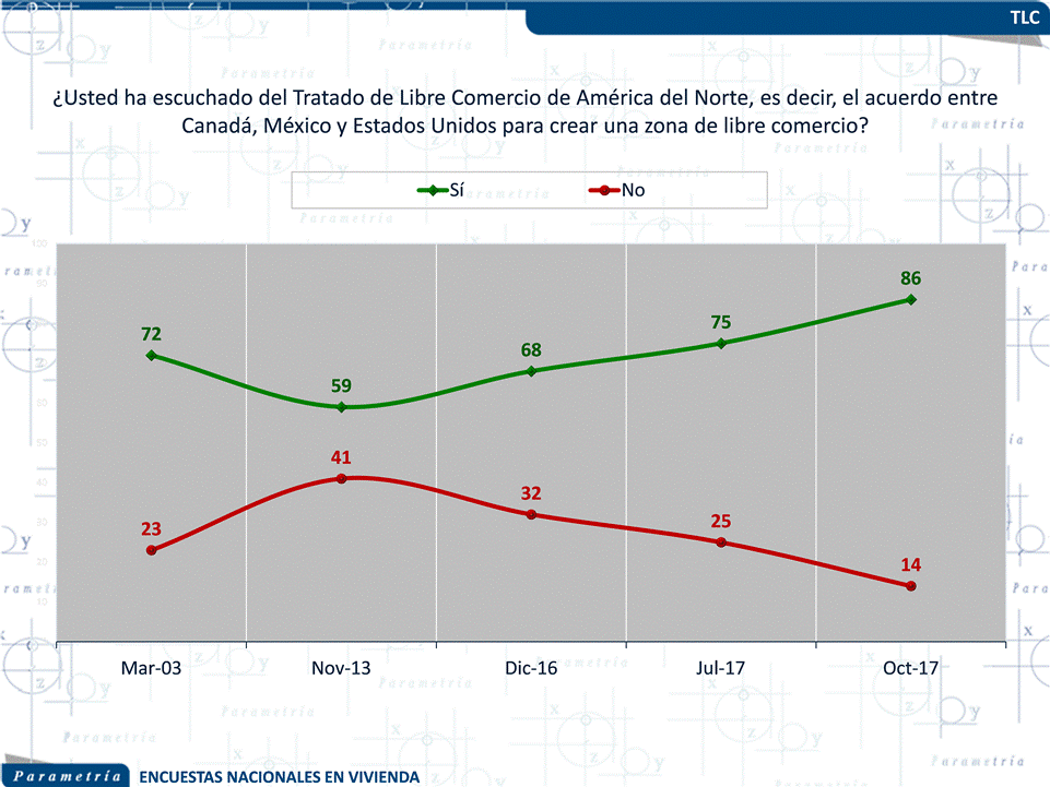En México, el TLCAN ha cobrado relevancia en este año, la serie histórica realizada por Parametría desde hace más de una década permite ver que hoy en día nueve de cada diez ciudadanos identifican este intercambio comercial. En 2003, la primera vez que se preguntó por este tema, el porcentaje de aquellos que lo conocía era de 72%, luego en 2013 disminuyó a 59% y para 2017 es conocido por el 86% de la población.