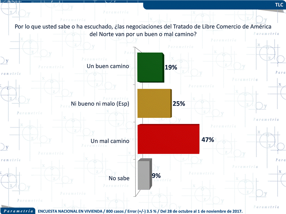 Un dato que llama la atención es que casi la mitad de la población mexicana (47%) considera que las negociaciones del TLCAN van por un mal camino; el 25% tiene una posición neutral pues consideran que las reuniones con representantes de los tres países no van por buen o mal camino, y únicamente 19% de la población considera que los encuentros van por buen camino.