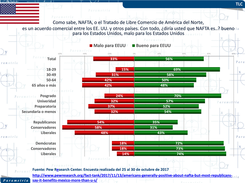 La encuesta telefónica realizada del 25 al 30 de octubre de 2017 muestra que el 56% de los norteamericanos considera que el North American Free Trade Agreement, NAFTA, por sus siglas en inglés es bueno para los Estados Unidos, mientras que 33% lo ve como un acuerdo comercial malo para su país.