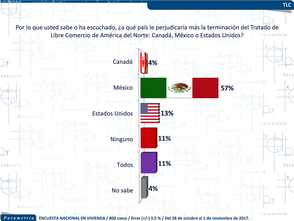 En una pregunta similar, Parametría preguntó a los mexicanos a qué país le perjudicaría más la terminación del Tratado de Libre Comercio de América del Norte, y la mayoría (57%) mencionó que nuestro país sería el más perjudicado. Sólo 13% considera que de ser cancelado el acuerdo, EEUU sería el más afectado y un porcentaje menor (4%) menciona que Canadá sería la nación más perjudicada con la decisión de terminarlo.