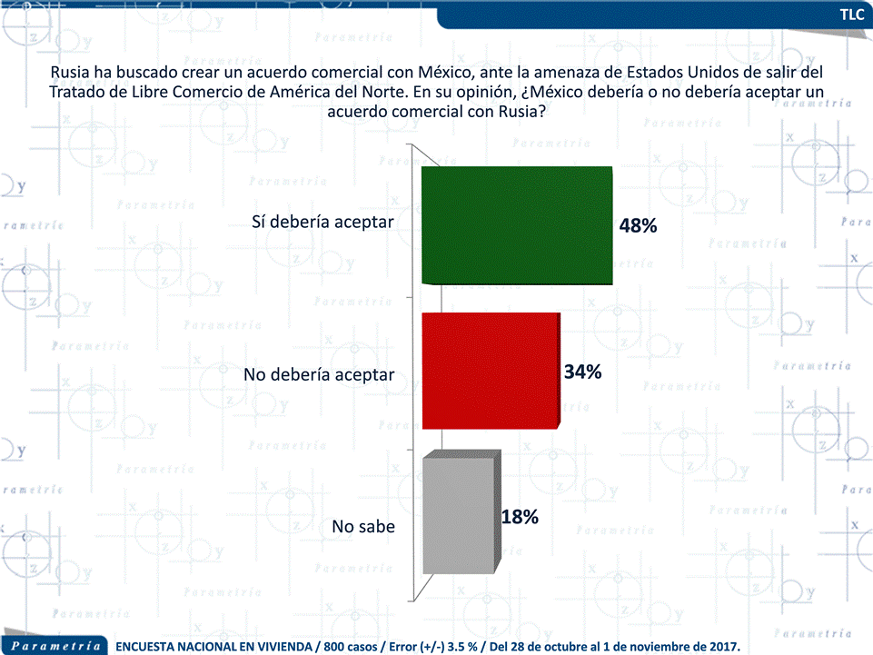Otro dato relevante es que casi la mitad de la población en México (48%), observa como una buena política que nuestro país acepte un acuerdo comercial con Rusia, nación que ha declarado su intención de reforzar los lazos comerciales con México[4], en tanto, el 34% de los entrevistados considera que México debería rechazar un posible acuerdo comercial con Rusia y 18% no contestó al cuestionamiento.