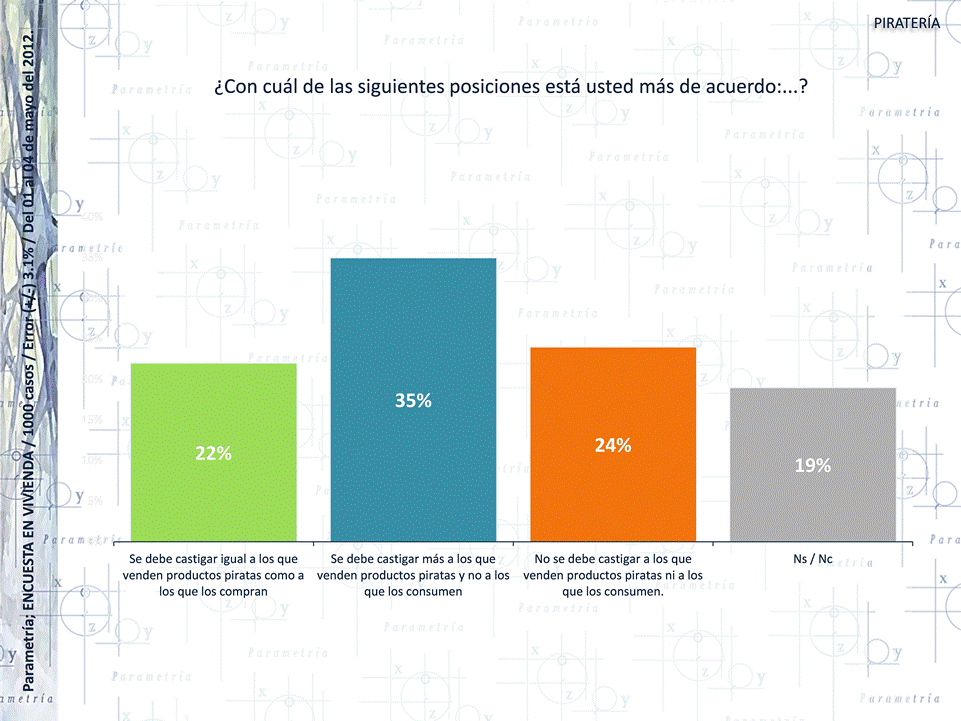 Uno porcentaje mayor, 24%, cree que no debe haber castigo ni para vendedores ni para consumidores de piratería, mientras que un 19% no toma posición al respecto.