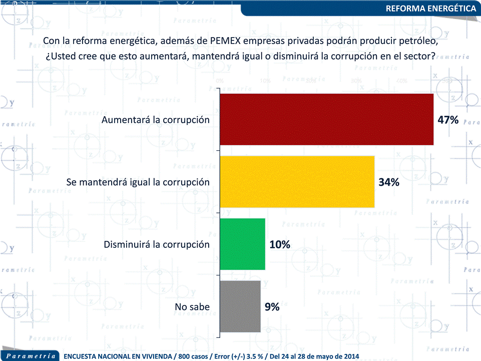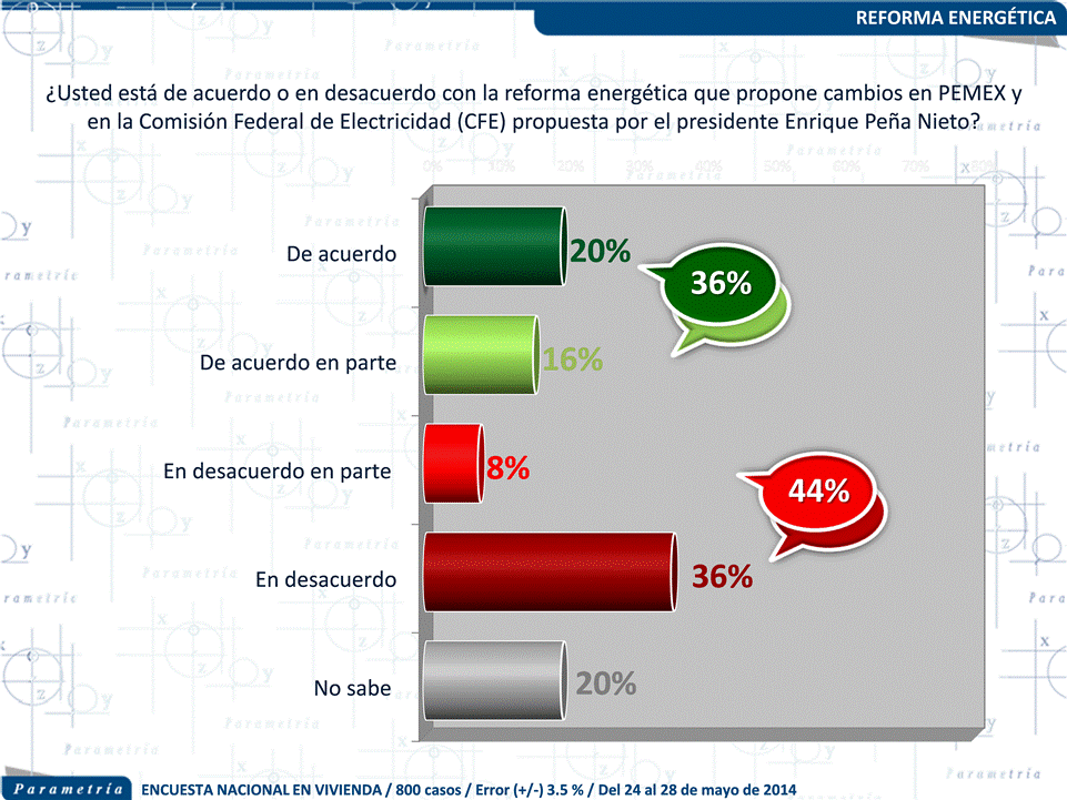 A pesar de los beneficios que tanto el gobierno federal como los que apoyan la reforma, han dicho que traerá la participación del sector privado en dicha industria, en la opinión pública permea el desacuerdo en realizar cambios en Pemex y la Comisión Federal de Electricidad (CFE), así lo manifiesta el 44 % de los entrevistados. Por otra parte, el 36 % se dijo “de acuerdo” o “de acuerdo en parte” en la reforma energética propuesta por Enrique Peña Nieto. Cabe señalar que un importante 20 % no se posicionó sobre el tema.