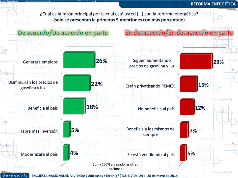 Uno de nuestros objetivos de la medición realizada en mayo de 2014, fue el de indagar los motivos por los cuales los mexicanos apoyan o rechazan la reforma, por lo que realizamos una pregunta abierta que nos diera luz en el tema. Al respecto, podemos observar que 26 % de los entrevistados dijo estar de acuerdo con la iniciativa porque la reforma generará empleos, 22 % cree que disminuirá los precios de la gasolina y de la luz y 18 % considera que la nueva ley beneficia al país, otro 5 % cree que habrá más inversión y 4 % dijo que modernizará al país.