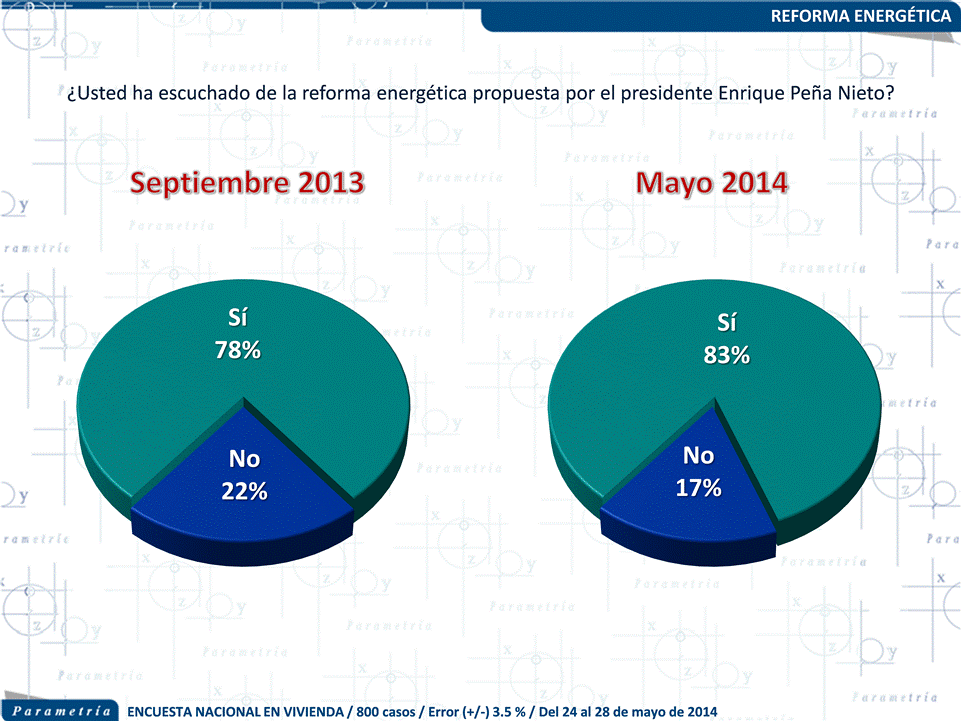 De acuerdo con la última encuesta nacional en vivienda realizada por Parametría, podemos observar que ocho de cada diez mexicanos (83 %), dicen haber escuchado de los cambios en materia energética propuestos por la actual administración. El conocimiento en el tema ha aumentado cinco puntos desde septiembre del año pasado cuando era de 78 %. Cabe señalar que a diferencia de otras reforma tales como la electoral o la financiera, la que toca el tema de los energéticos es una de las propuestas contempladas en el Pacto por México más conocidas entre los mexicanos.