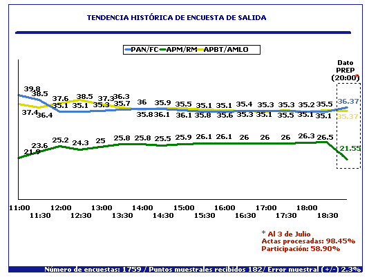La cerrada votación tuvo como consecuencia que a las 20:00 horas los datos de la encuesta de salida no permitieran determinar con precisión estadística las tendencias de primer y segundo lugar. Únicamente estaba clara la estimación del tercer lugar para el Partido Revolucionario Institucional, con 26.5 de los sufragios.