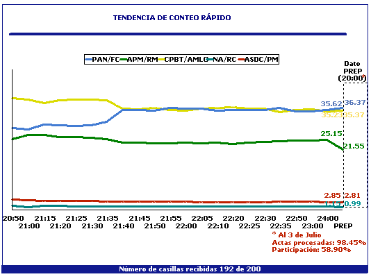 El aspirante de la coalición Por el Bien de Todos alcanzó su punto más alto a las 12:30, cuando recibía 38.5% de los sufragios. Al final de la jornada, López Obrador tenía 35.5 de os votos y Calderón 35.1%.
