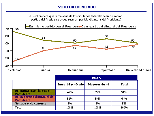 En sistemas presidenciales como el mexicano, el voto divido muestra la preferencia que sociedad mantiene frente a la repartición del poder entre poder ejecutivo y el legislativo. A través de una encuesta a la salida de las casillas aplicada por Parametría es posible analizar que los electores a medida que poseen mayores niveles de escolaridad prefieren que la mayoría de la Cámara de Diputados sea de un partido distinto al del Presidente. Es decir, los electores que cuentan con mejores habilidades para procesar información política explícitamente favorecen un sistema real de pesos y contrapesos.