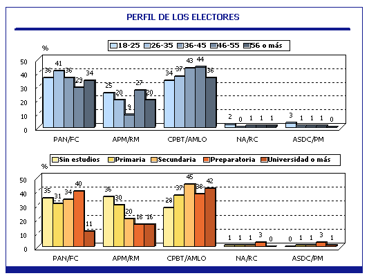 Los candidatos del Partido Acción Nacional y de la coalición Por el Bien de Todos se dividieron la mayoría de los jóvenes que acudieron por primera vez a una elección presidencial, las mujeres y la gente con más educación. Un 36% de los mexicanos de entre 18 y 25 años dieron su apoyo a Felipe Calderón, 34% a Andrés Manuel López Obrador y 25% a Roberto Madrazo, de la Alianza por México.