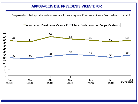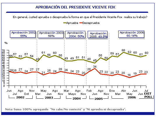 La serie de Parametría muestra que el presidente Vicente Fox llegó a las elecciones con mejor aprobación que cuando obtuvo la victoria en los comicios del 2000, en que era avalado por 55% de los mexicanos.