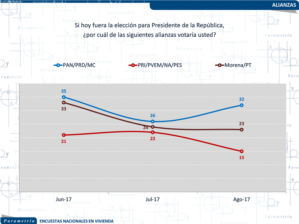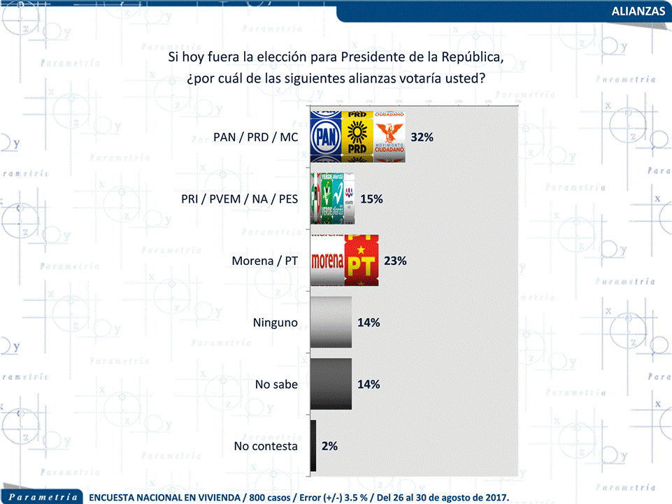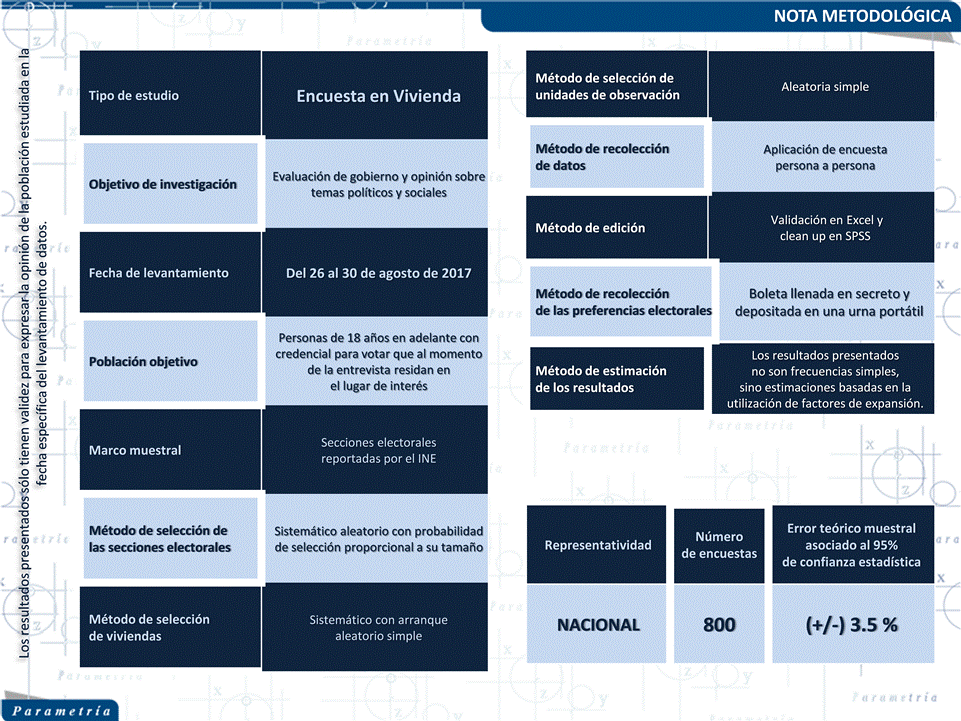 Parametría. Encuesta en vivienda. Representatividad: Nacional. Número de entrevistas: 800 encuestas realizadas del 26 al 30 de agosto de 2017. Nivel de confianza estadística: 95 %. Margen de error: (+/-) 3.5 %. Diseño, muestreo, operativo de campo y análisis: Parametría SA de CV. Método de muestreo: Aleatorio sistemático con probabilidad proporcional al tamaño. Unidad de muestreo: Las secciones electorales reportadas por el INE. Población objetivo: Personas de 18 años en adelante con credencial para votar que al momento de la entrevista residan en el lugar de interés.