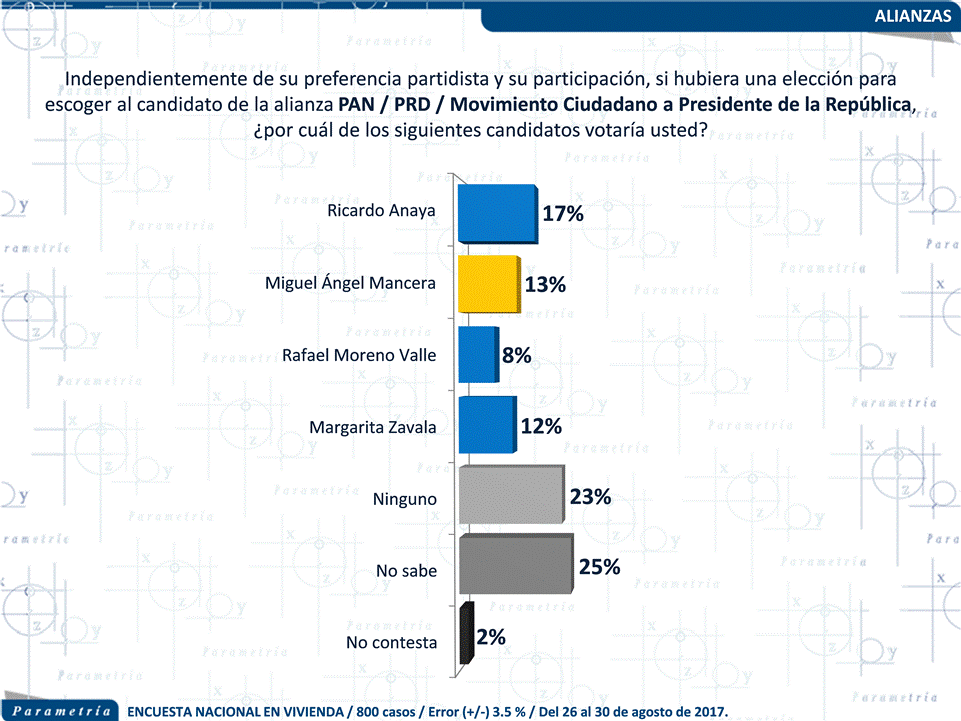 En cuanto a quién debería ser el candidato de la alianza PAN-PRD-MC a la Presidencia de la República, un mayor porcentaje de encuestados dijo que votaría por Ricardo Anaya como abanderado de la coalición (17%), le sigue Miguel Ángel Mancera con el 13%. En tercer sitio aparece Margarita Zavala con el 12% y finalmente Rafael Moreno Valle con el 8%. El 23% de los entrevistados dijo no saber por quién votar y 23% afirmó que no votaría por ninguno de los personajes que se mencionaron.