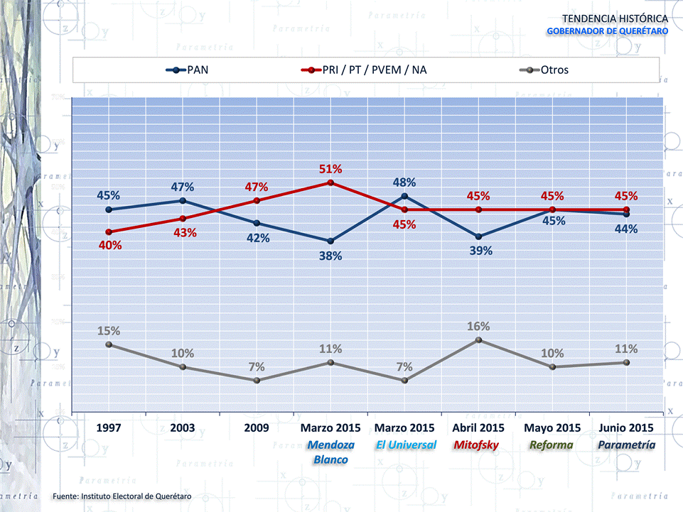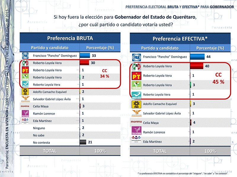 PARAMETRÍA. Encuesta en vivienda. Representatividad: Estatal. Número de entrevistas: 1,000 cuestionarios hechos a personas de 18 años en adelante con credencial para votar que residan en el lugar de interés al momento de la entrevista. Fecha de levantamiento: del 27 al 31 de mayo 2015. Tasa de Rechazo: 32 %. Nivel de confianza estadística: 95 %. Margen de error: (+/-) 3.1 %. Diseño, muestreo, operativo de campo y análisis: Parametría SA de CV. Método de muestreo: Aleatorio sistemático con probabilidad proporcional al tamaño. Unidad de muestreo: Las secciones electorales reportadas por el INE. Patrocinador: Parametría SA de CV
