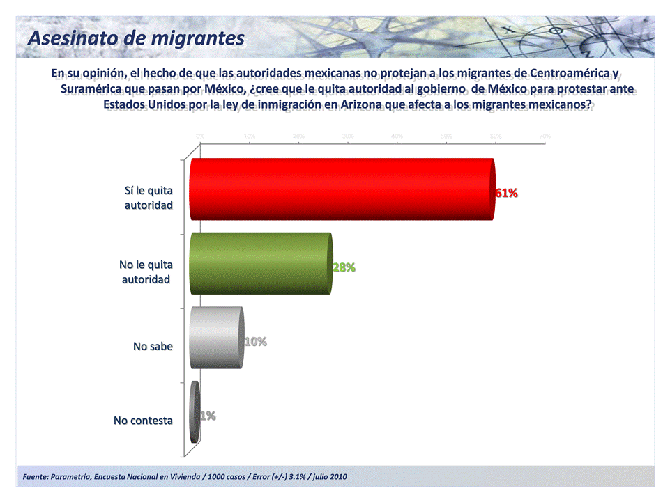 Un 61% cree que el hecho de que instancias mexicanas no protejan a los migrantes centroamericanos que pasan por México,le resta autoridad al gobierno para protestar ante Estados Unidos por las afectaciones a migrantes mexicanos en territorio estadounidense.