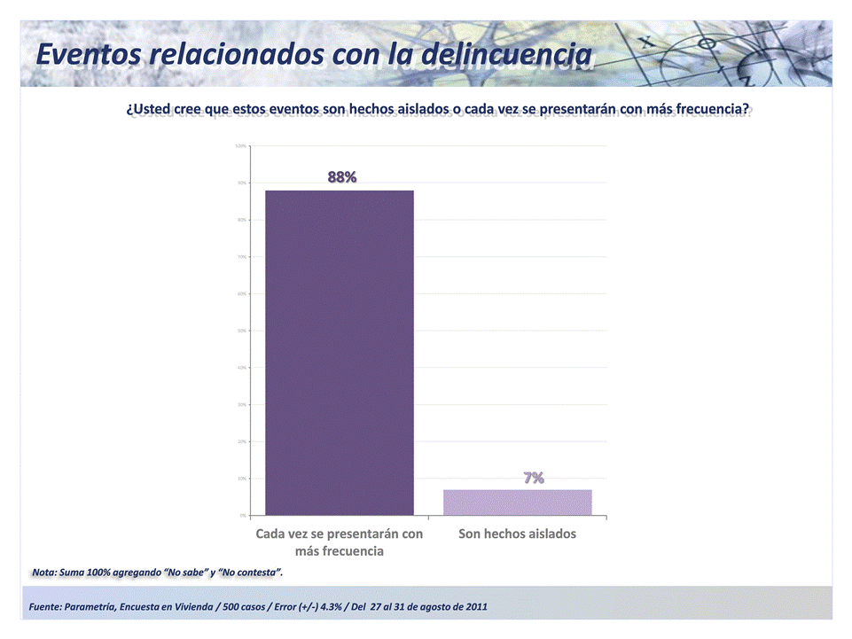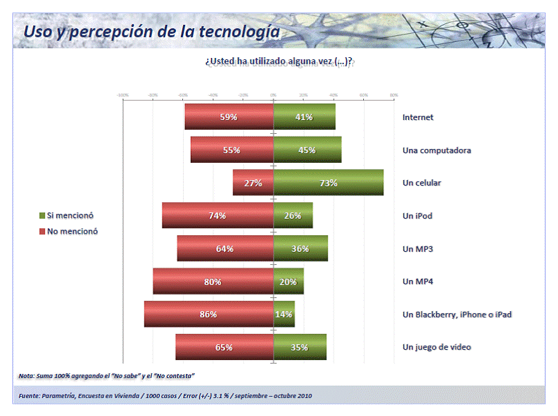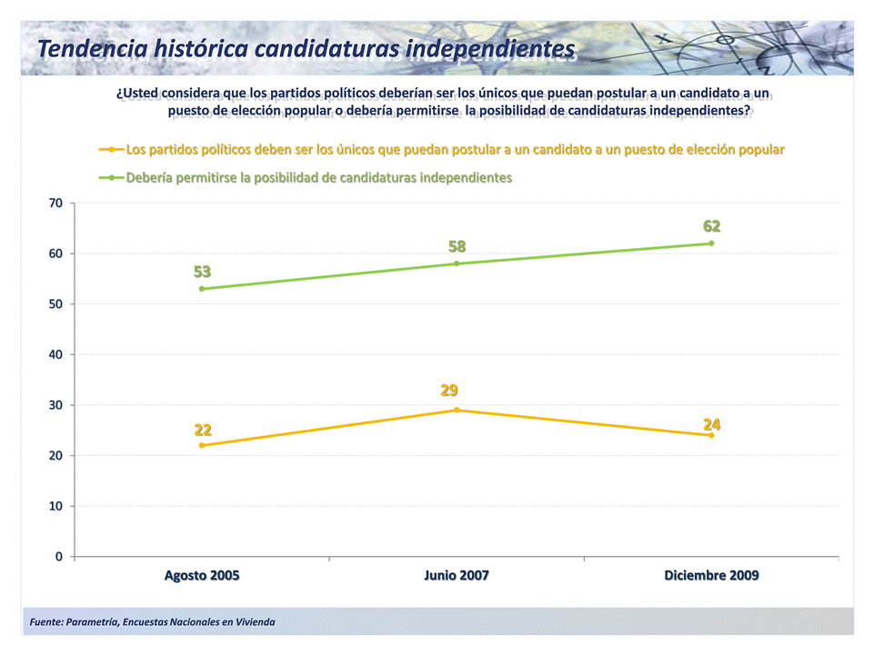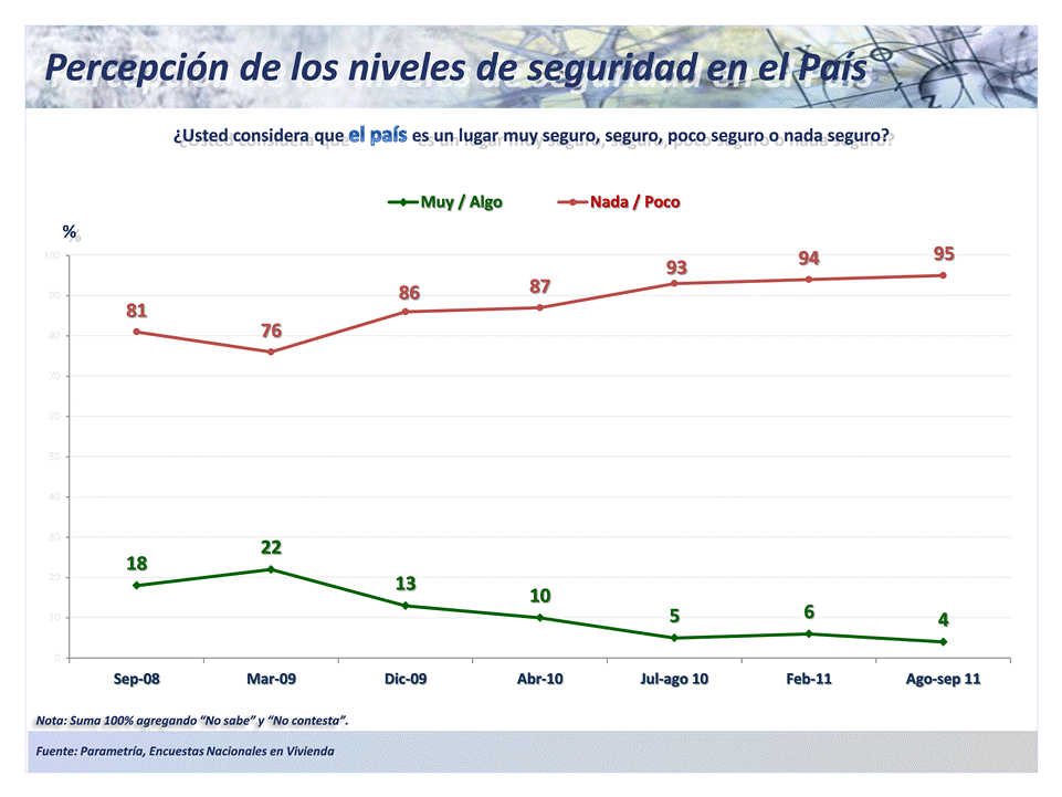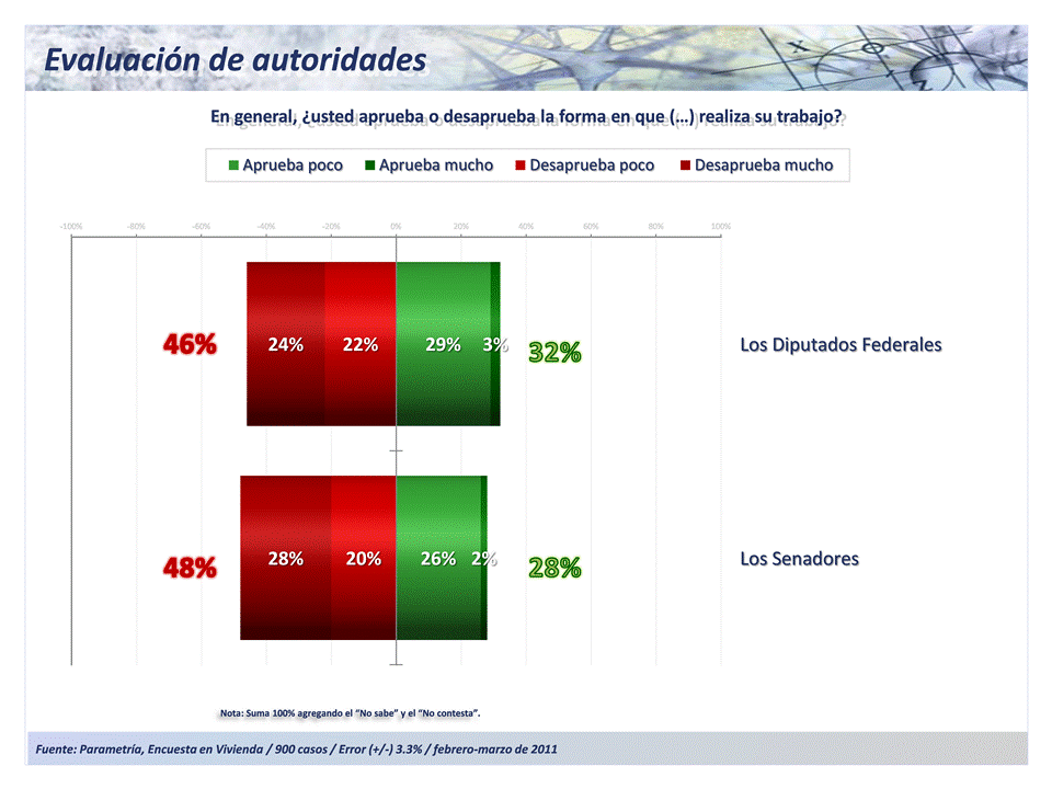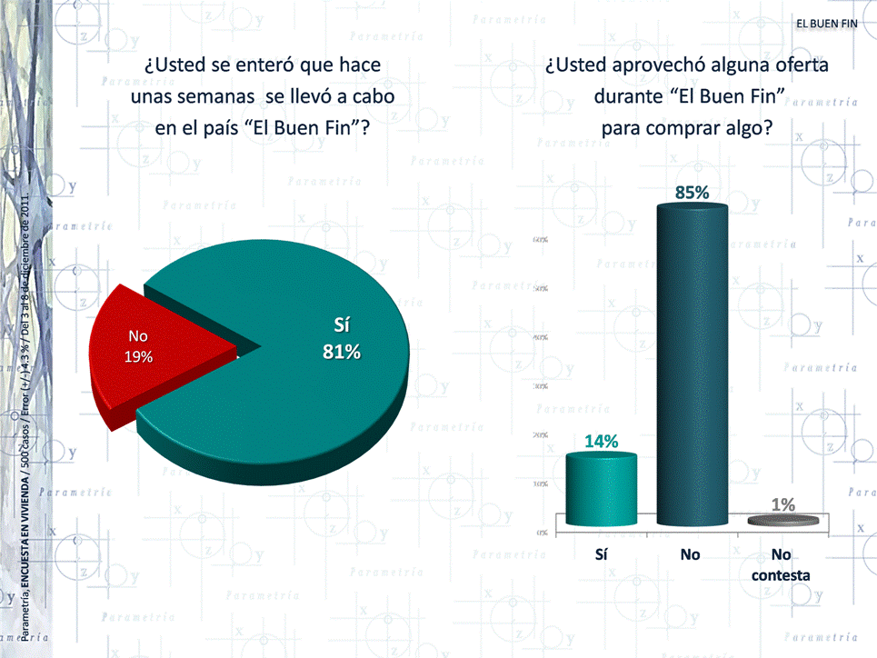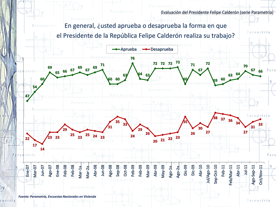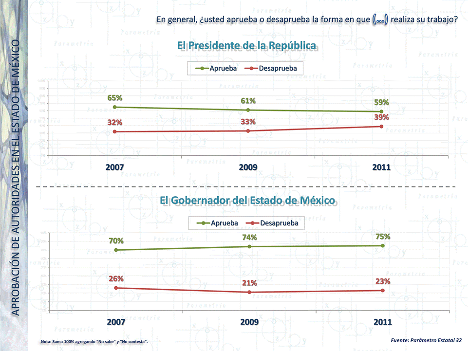 PARAMETRÍA.Encuestas Nacionales en vivienda. Representatividad: Nacional. El número de entrevistas varía de acuerdo a cada estudio. Nivel de confianza estadística: 95%. El margen de error cambia de acuerdo al tamaño de muestra de cada estudio. Muestreo, operativo de campo y análisis: Parametría SA de CV. Método de muestreo: Aleatorio sistemático con probabilidad proporcional al tamaño. Unidad de muestreo: