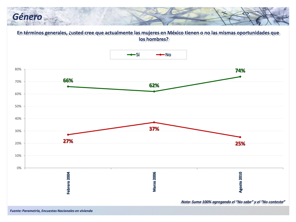 Datos del estudio de equidad y género de Parametría revelan que el 74% de los mexicanos cree que, en general, las mujeres y los hombres tienen las mismas oportunidades.