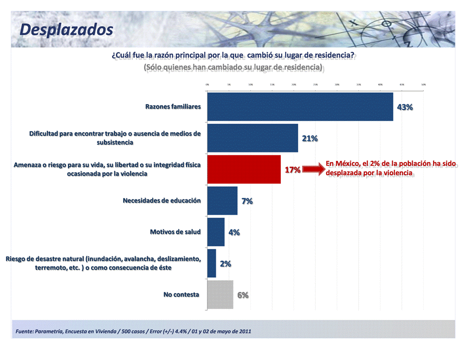 De acuerdo con los datos de Parametríade las personas que se movieron de residencia en México en los últimos 5 años, el 17% manifestó haberlo hecho por causas relacionadas con la violencia (desplazamiento forzado). El número representa el 2% del total de personas de 18 años o más en el país.