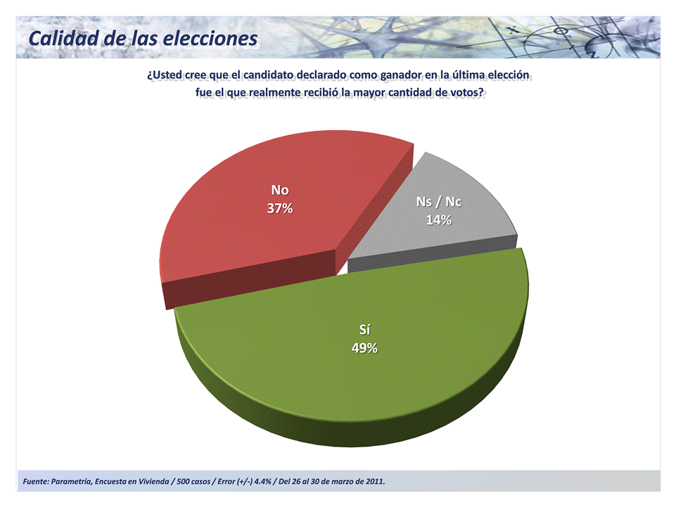 Únicamente 49% de los mexicanos cree que, en la más reciente elección, el candidato declarado ganador fue el que realmente obtuvo la mayor cantidad de votos.El 39% de los entrevistados no cree que las elecciones en su estadosean libres, equitativas y limpias.