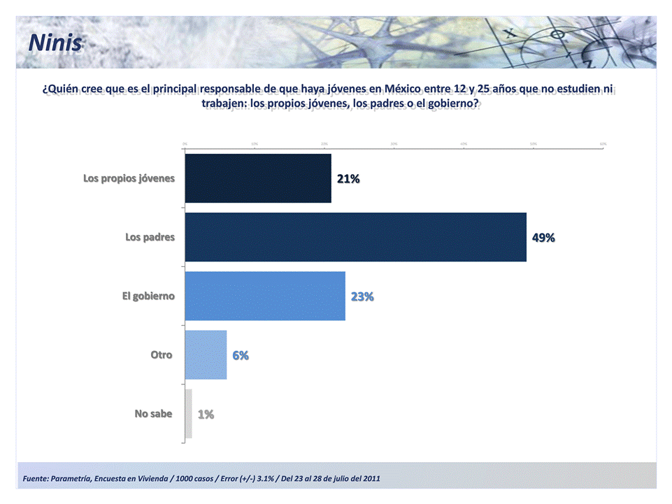 Sólo 23% de los mexicanos adjudica al gobierno la responsabilidad principal por la existencia de los «ninis», mientras que 21% lo hace a los propios jóvenes.