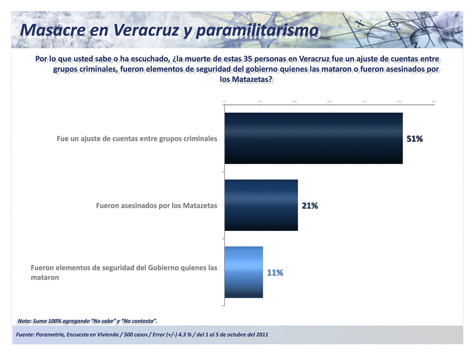 Ocho de cada diez mexicanos (78%) se enteraron del asesinato de 35 personas y del abandono de cuerpos en Boca del Río, Veracruz. Para la mitad de los encuestados, el crimen fue un ajuste de cuentas entre grupos criminales.