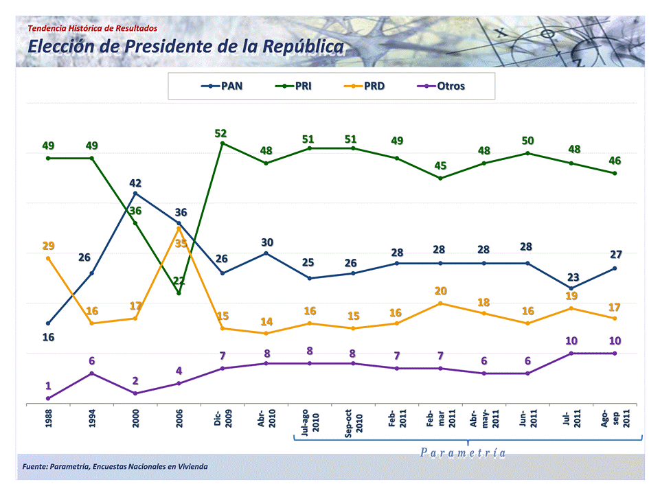 La tendencia histórica de resultados en elecciones presidenciales muestra que de diciembre de 2009 a la fecha ha sido el PRI el que domina la preferencia electoral, seguido siempre del PAN. Se advierte que la brecha entre el tricolor y el blanquiazul se ha cerrado, de 26 puntos en diciembre del 2009 a 19 en la medición de agosto y septiembre. Rezagado queda el PRD, que desde las elecciones del 2006 no ha logrado más de 20% en las mediciones.