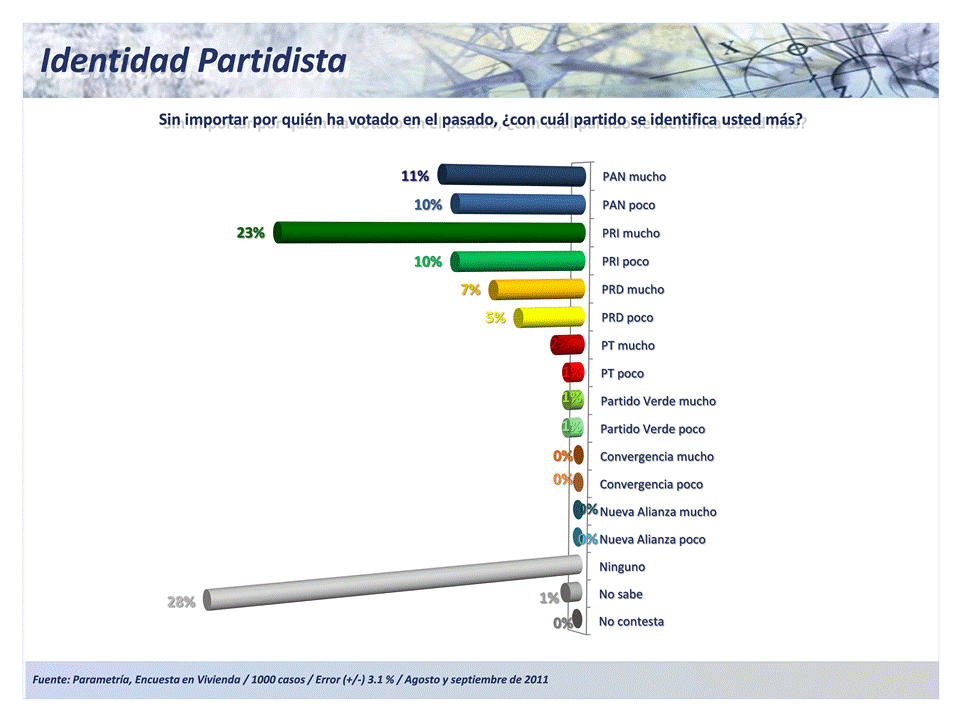 Los mexicanos votan más por el candidato (como persona) que por el partido político que lo impulsa. El partido con el que más ciudadanos se identifican (en mucho o poco grado) es el PRI, con 33%, le siguen el PAN con 21% y en tercer lugar el PRD con 12%