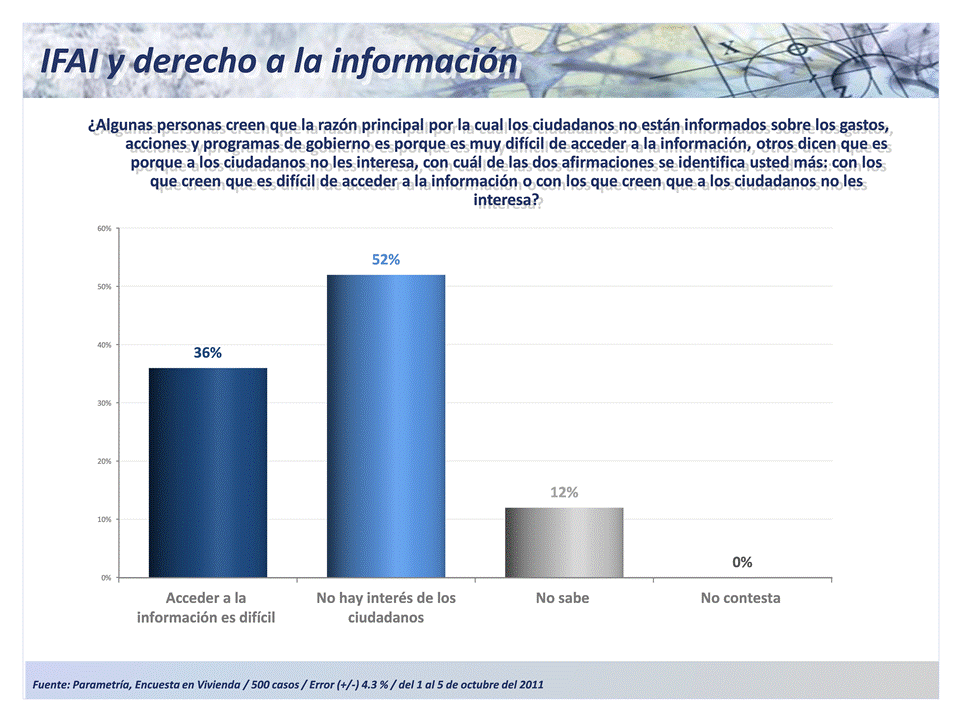 Existe, en general, escaso interés de los mexicanos en la transparencia, 52% piensa que la razón principal por la cual los ciudadanos no están informados sobre los gastos, acciones y programas de gobierno es porque no les interesa.