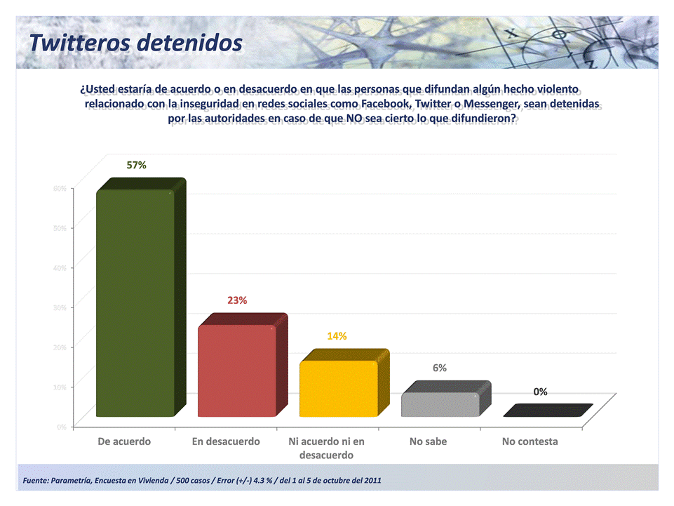 Un 57% de mexicanos está a favor de que las autoridades detengan a ciudadanos que difundan, sin confirmar, hechos violentos a través de las redes sociales en internet.