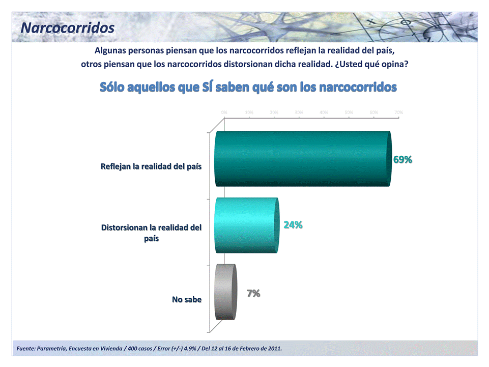 Siete de cada diez personas que conocen los narcocorridos creen que éstos reflejan la realidad del país.