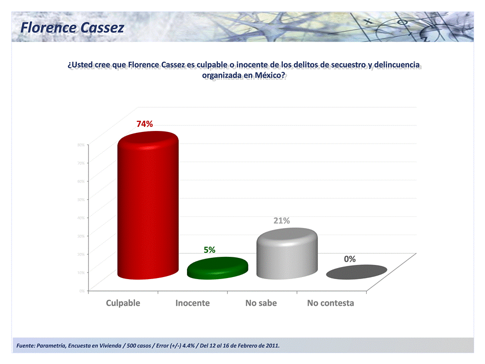 La mayoría de los mexicanos (74%) considera que la francesa Florence Cassez es culpable de secuestro y delincuencia organizada.