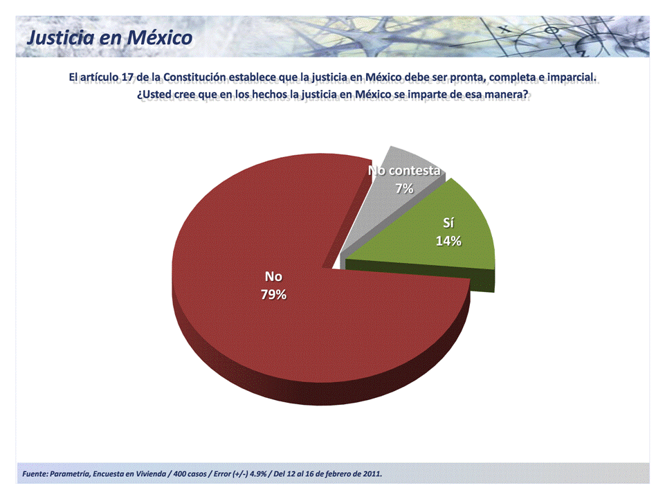 De acuerdo con los estudios de Parametría, ocho de cada diez mexicanos opinaron que la justicia en México no se impartía de forma pronta, completa e imparcial.