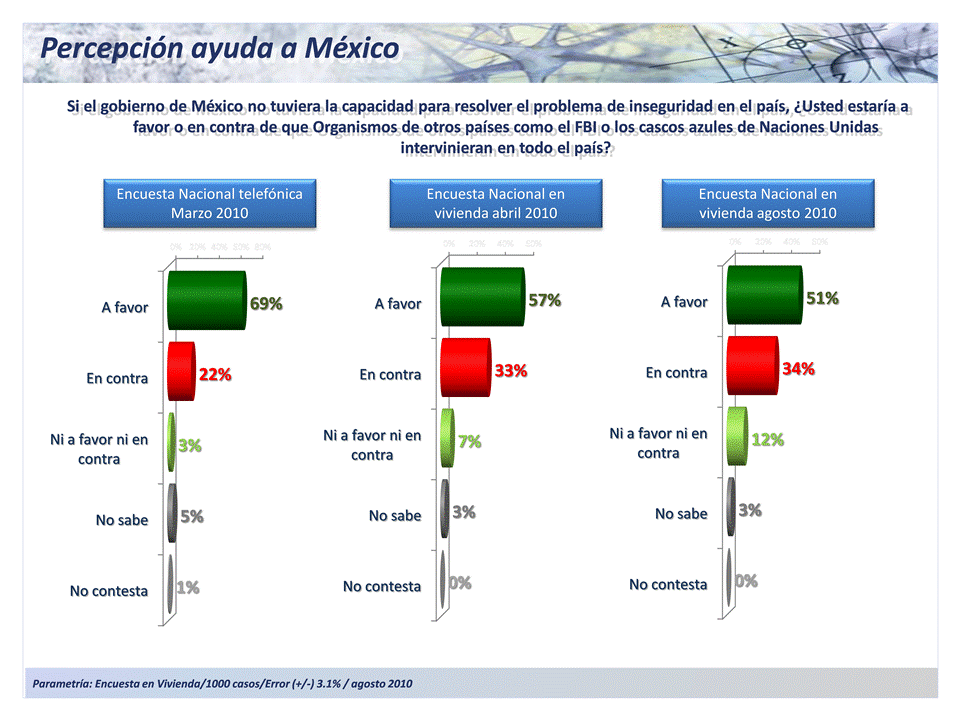 Cinco de cada diez mexicanos están a favor de que intervengan en México organismos internacionales como el FBI o los Cascos Azules de la ONU, en caso de que el gobierno no tenga la capacidad de resolver el problema de la inseguridad en el país.