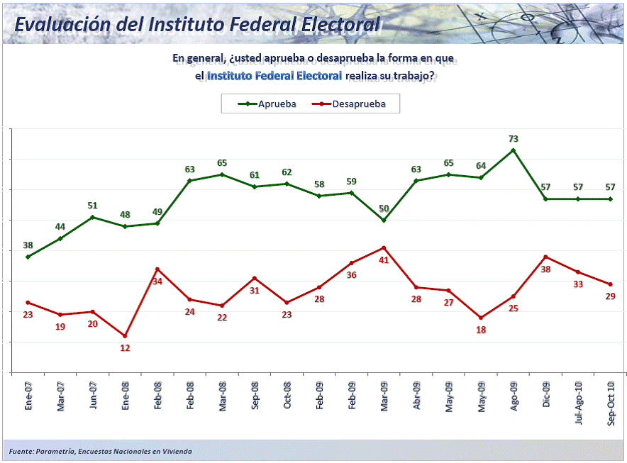 El Instituto Federal Electoralpresenta altos niveles de aprobación (57%), pero sin poder llegar a los niveles de 2009, cuando obtuvo los puntos más altos de aprobación, de acuerdo al registro histórico de Parametría.