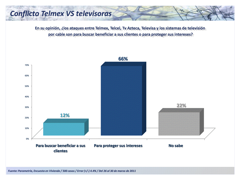 Dos de cada 3 mexicanos compartieron la opinión de que la llamada guerra de las telecomunicaciones (entre Telmex, Telcel, Televisa y Tv Azteca), era un enfrentamiento que buscaba proteger los intereses de los monopolios en México y no beneficiar, en ningún grado, a los consumidores.