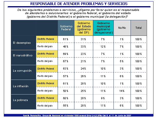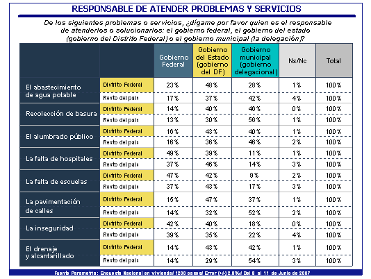 Mientras tanto, para al menos cuatro de cada diez de los habitantes de la ciudad de México es el gobierno del Distrito Federal el encargado de responder a dichas necesidades. Es decir, reconocen menos responsabilidad en las autoridades delegacionales.