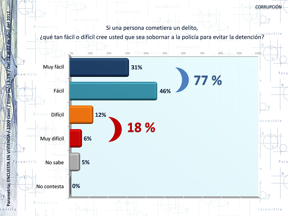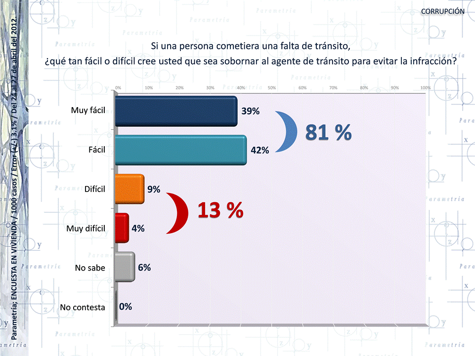Al respecto, de acuerdo con la Encuesta Nacional en Vivienda de Parametría de abril, el 81% de los mexicanos considera que es muy fácil o fácil sobornar a un agente de tránsito para evitar una infracción.