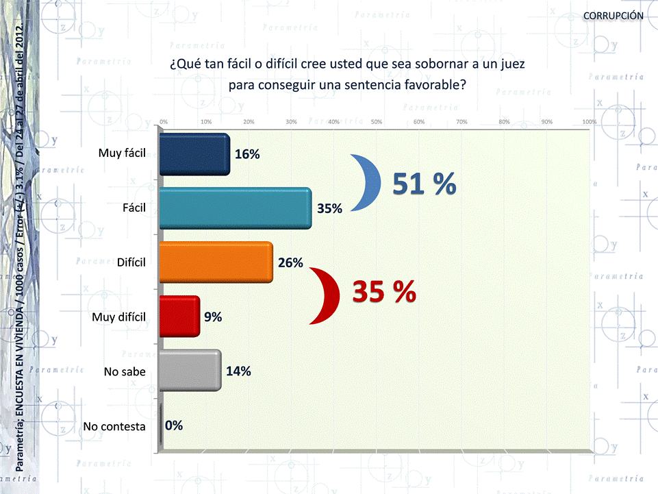 Aun cuando es menor en comparación con los anteriores casos la percepción de facilidad para sobornar a un juez, un 51% de mexicanos dijo que era muy fácil o fácil hacerlo con el fin de conseguir una sentencia favorable.