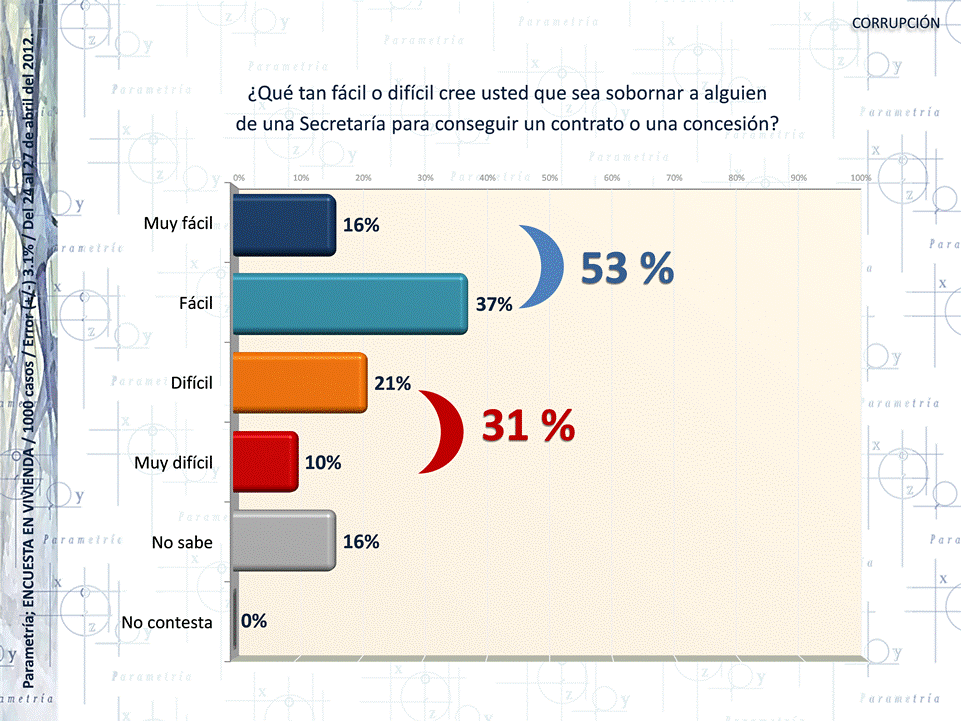 PARAMETRÍA.Encuesta Nacional en vivienda. Representatividad: Nacional. Número de entrevistas: 1000 encuestas del 24 al 27 de abril de 2012. Nivel de confianza estadística: 95%. Margen de error: (+/-) 3.1%. Diseño, muestreo, operativo de campo y análisis: Parametría SA de CV. Método de muestreo: Aleatorio sistemático con probabilidad proporcional al tamaño. Unidad de muestreo: Las secciones electorales reportadas por el IFE. Población objetivo: Personas de 18 años en adelante con credencial para votar que al momento de la entrevista residan en el lugar de interés.