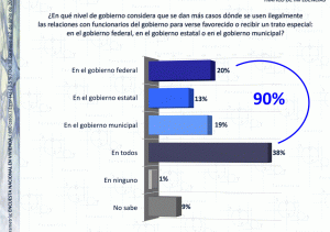 En la población mexicana, posiblemente por el conocimiento de estos sucesos, existe una gran desconfianza en los funcionarios de gobierno. De acuerdo con la más reciente encuesta nacional en vivienda de Parametría, 90 % de los entrevistados considera que en los distintos niveles de gobierno se usan ilegalmente las relaciones con funcionarios para obtener algún favor o recibir un trato especial. El 38 % de las personas afirma que el uso de influencias ocurre en los tres niveles de gobierno; el 20 % supone que es frecuente en el gobierno federal; el 19 % asevera que donde más se saca provecho de las relaciones con funcionarios es en los gobiernos municipales; y el 13 % piensa que esto ocurre constantemente en el gobierno estatal; y sólo el 1 % cree que esto no sucede en ninguna instancia de gobierno.