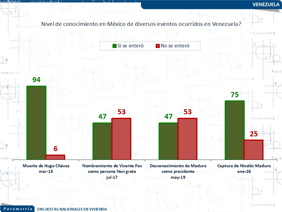 El evento de la captura de Nicolás Maduro por parte de Estados Unidos tuvo un alto nivel de difusión en México, ya que 75% de los encuestados afirmó haberse enterado. Este nivel de conocimiento es comparable con otros acontecimientos relevantes relacionados con Venezuela, como la muerte de Hugo Chávez, que sigue siendo el hecho más conocido entre la población mexicana. Esto sugiere que los eventos extraordinarios o simbólicos tienden a tener mayor impacto en la opinión pública que los procesos políticos de largo plazo.