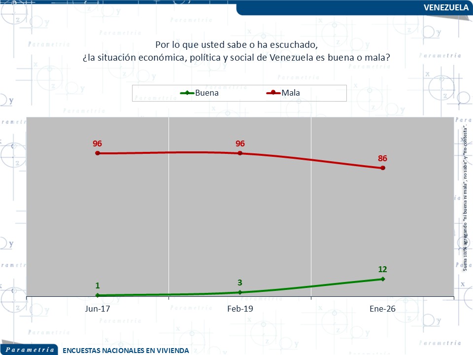 En primer lugar, seis de cada diez mexicanos han escuchado sobre la situación que vive Venezuela. Aunque este nivel de conocimiento es relevante, también indica que una proporción importante de la población (38%) no está informada, lo que sugiere que el tema, si bien presente en la agenda pública, no es prioritario para todos los sectores. Aun así, entre quienes conocen el tema, la evaluación es ampliamente crítica: 86% considera que la situación en Venezuela es mala, frente a solo 12% que la percibe como buena. Esta visión negativa ha sido consistente a lo largo del tiempo.