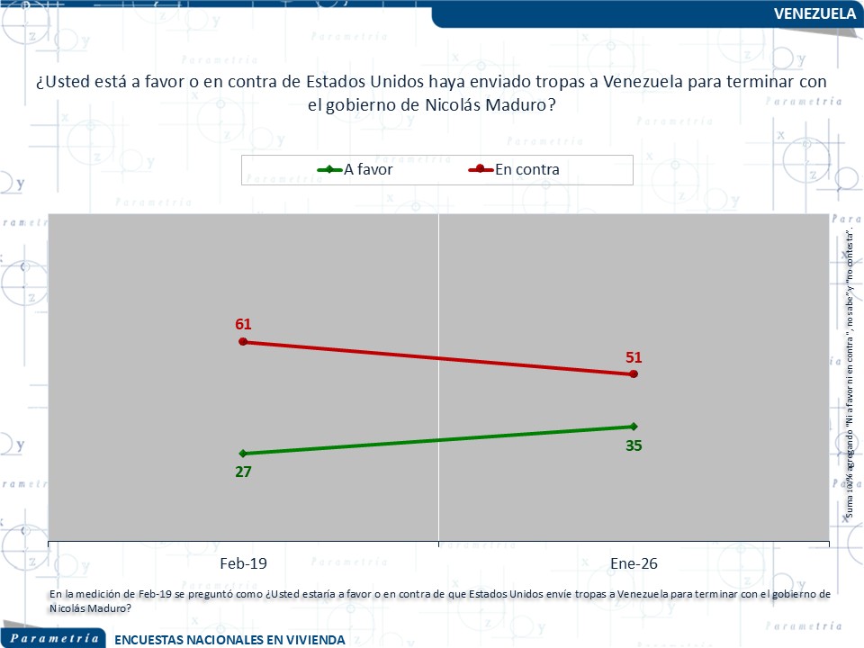 Con estos últimos datos podemos ver claramente cómo conviven do opiniones contradictorias. Casi seis de cada diez apoyan la salida de Maduro, pero más de la mitad está en contra de la intervención de Estados Unidos o de sus recientes acciones. Es decir, el ciudadano quisiera lo mejor de ambos mundos: cambio de régimen, pero sin pagar el costo de la intervención.