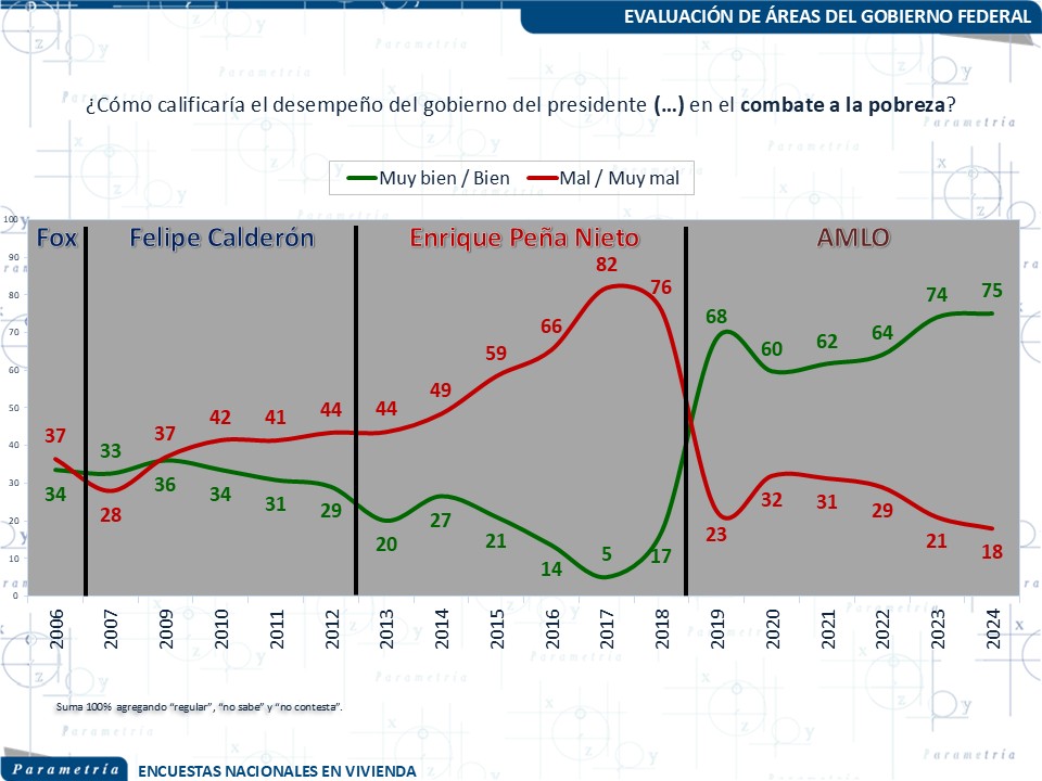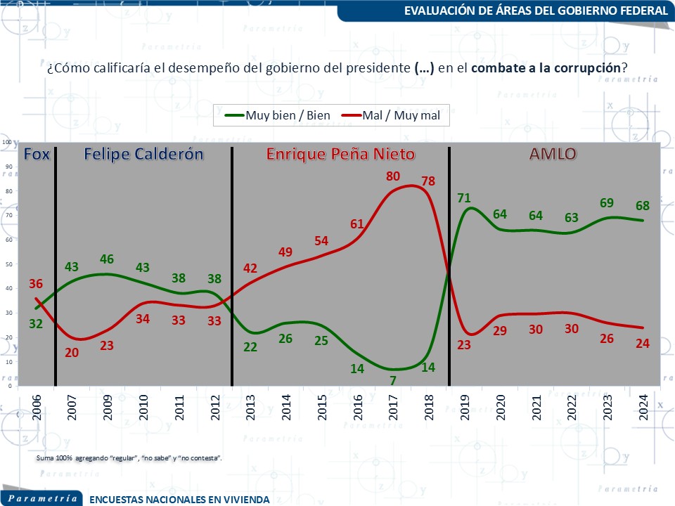 No obstante estas diferencias entre administraciones es necesario contar con comparaciones históricas para determinar si el los porcentajes que observamos en el agregado de la aprobación o por separado, en cada área de gobierno, son altos o bajos. También nos ayudan a determinar que factor pesó más en cada presidencia. Y finalmente que similitudes o diferencias puede haber entre una presidencia y otra. Por ello la comparación con los números del antecesor de la actual Presidenta Claudia Sheinbaum, son imprescindibles.
