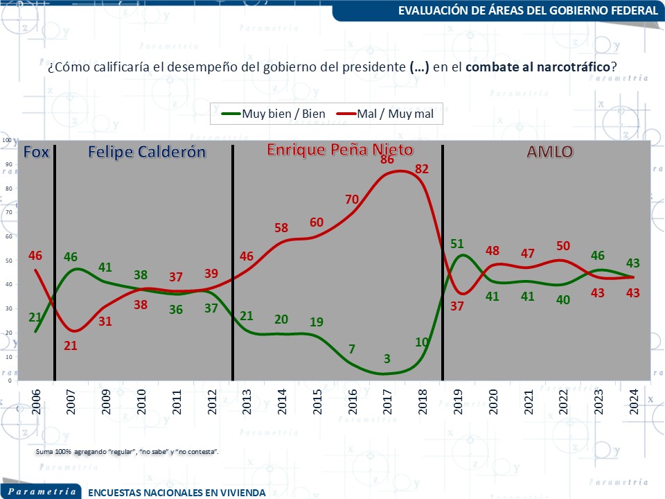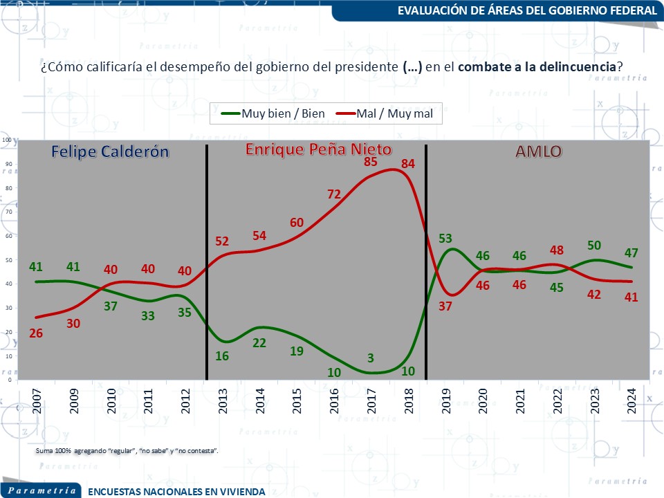 El combate a la delincuencia organizada y la inseguridad pública fueron los rubros con peores evaluaciones. Encuestas muestran que la percepción ciudadana sobre avances en narcotráfico y delincuencia fue consistentemente negativa. Sin embargo, este tema no fue suficiente para erosionar su aprobación general, debido al peso mayor de los factores económicos y sociales.